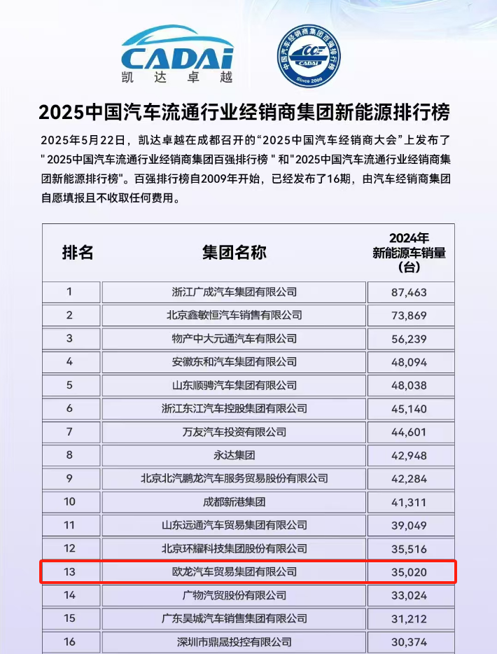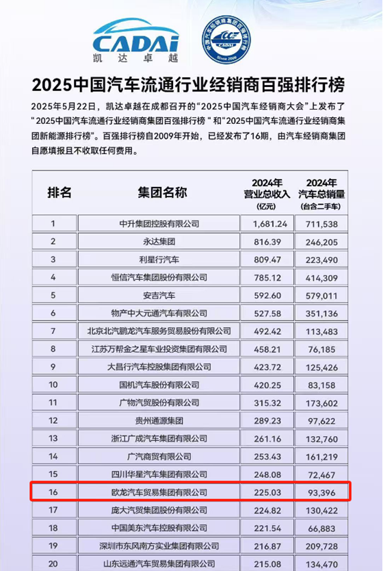 5月22日,中國汽車流通協會正式揭曉“2025中國汽車經銷商集團百強排行榜”。歐龍汽車集團憑借綜合運營實力、盈利水平及可持續發展潛力,以第16名的優異成績連續16年穩居百強,創下行業里程碑。在新能源領域,集團以分榜第13名持續領跑區域市場。